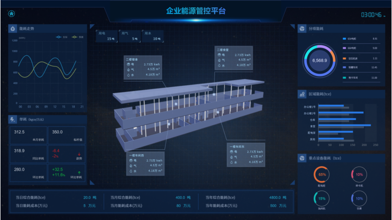 展示企業(yè)各類能耗總量、折標(biāo)值、能源成本、能源消耗趨勢、分項能耗占比、區(qū)域能源消耗對比,以及當(dāng)前天氣情況、污染情況,并三維展示企業(yè)重要工藝或工段的能源消耗動態(tài)。