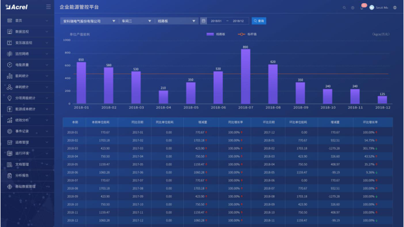 與企業(yè)MES系統(tǒng)對接,通過產(chǎn)品產(chǎn)量以及系統(tǒng)采集的能耗數(shù)據(jù),在產(chǎn)品單耗中生成產(chǎn)品單耗趨勢圖,并進行同比和環(huán)比分析。以便企業(yè)能夠根據(jù)產(chǎn)品單耗情況來調(diào)整生產(chǎn)工藝,從而降低能耗。