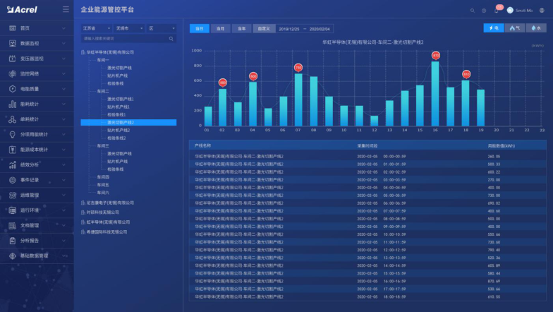 系統(tǒng)對區(qū)域、工段、設(shè)備能源消耗進行數(shù)據(jù)采集,監(jiān)測重點設(shè)備及工藝運行狀態(tài),如溫度、濕度、流量、壓力、速度等,并支持變配電系統(tǒng)一次運行監(jiān)視??芍苯訌膭討B(tài)監(jiān)測平面圖快速瀏覽到所管理的能耗數(shù)據(jù),支持按能源種類、車間、工段、時間等維度查詢相關(guān)能源用量。