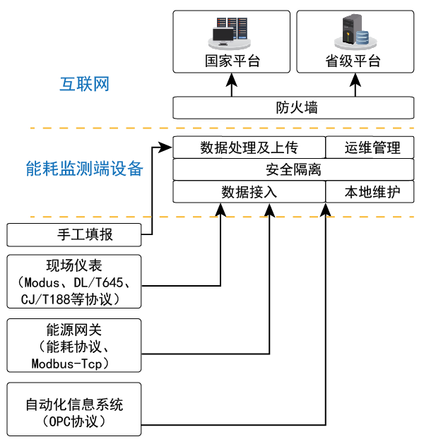 通過計量儀表、工控系統(tǒng)等采集、匯總本單位能耗數(shù)據(jù),將數(shù)據(jù)上傳至省級平臺,或直接上傳至國家平臺;